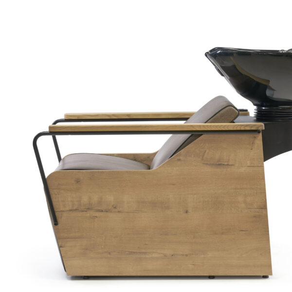 Accoudoirs en chêne massif verni : Des accoudoirs en bois de chêne apportent une touche naturelle et chaleureuse au design industriel de ce bac de lavage.