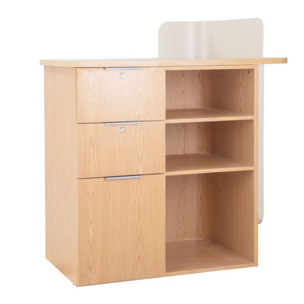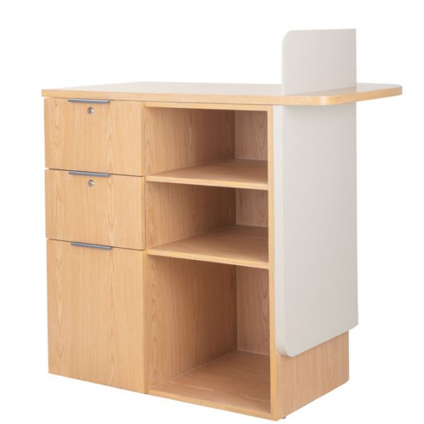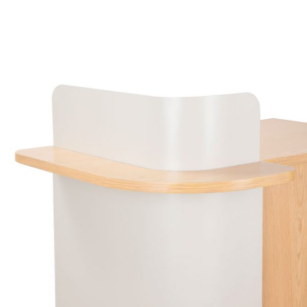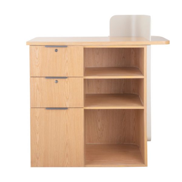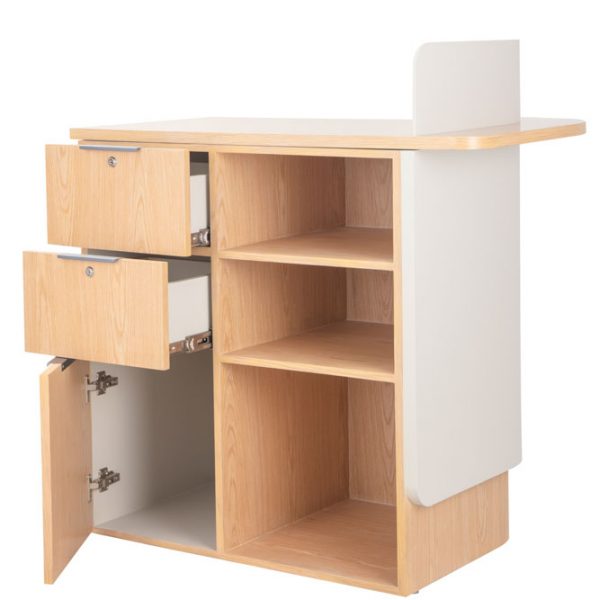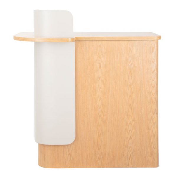 - Étagère d’exposition polyvalente : La caisse de réception est dotée d’une étagère d’exposition, idéale pour mettre en valeur des produits ou offrir des brochures, renforçant ainsi votre image de marque.